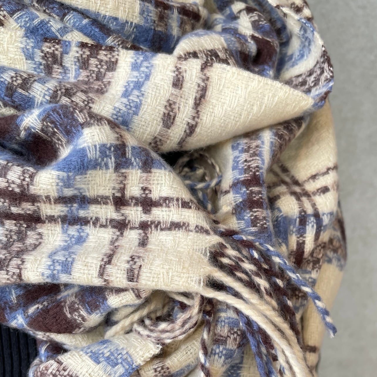 くすみがちなお顔周りも、ひと巻きするだけで華やかにしてくれる配色チェック柄です。