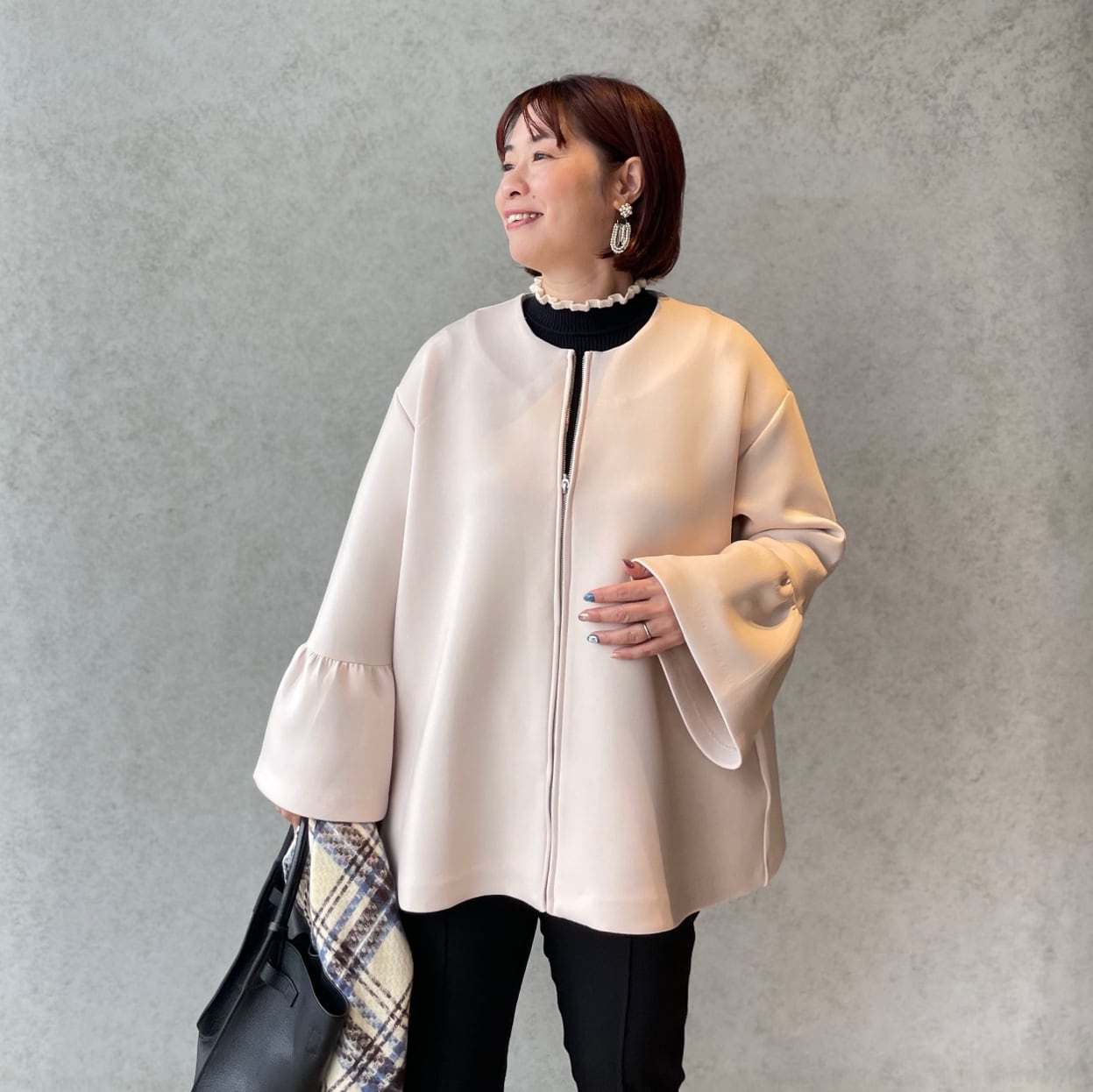 ハーフ丈だから、車や自転車移動でも動きやすくサッと羽織れる便利さが魅力。