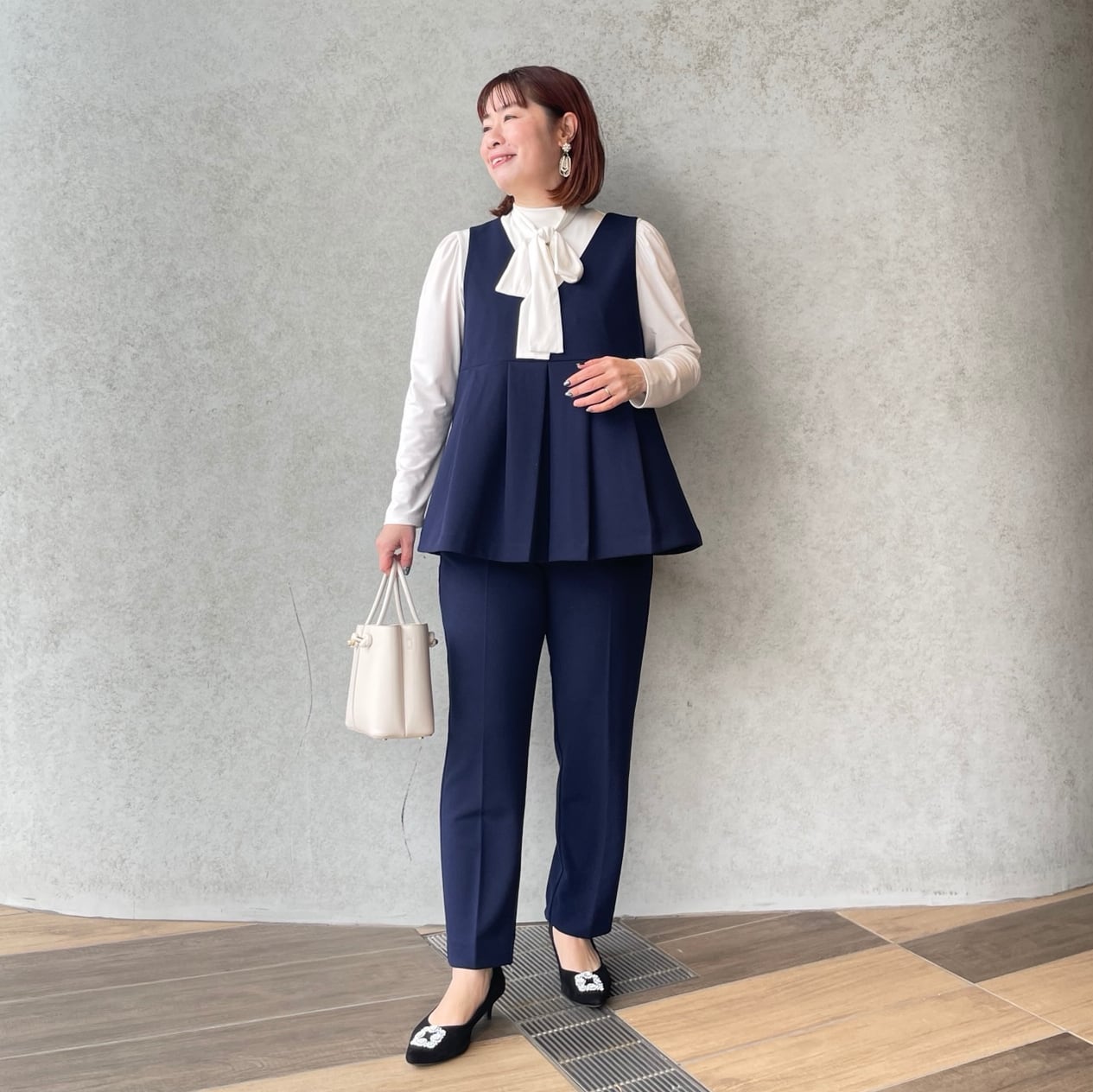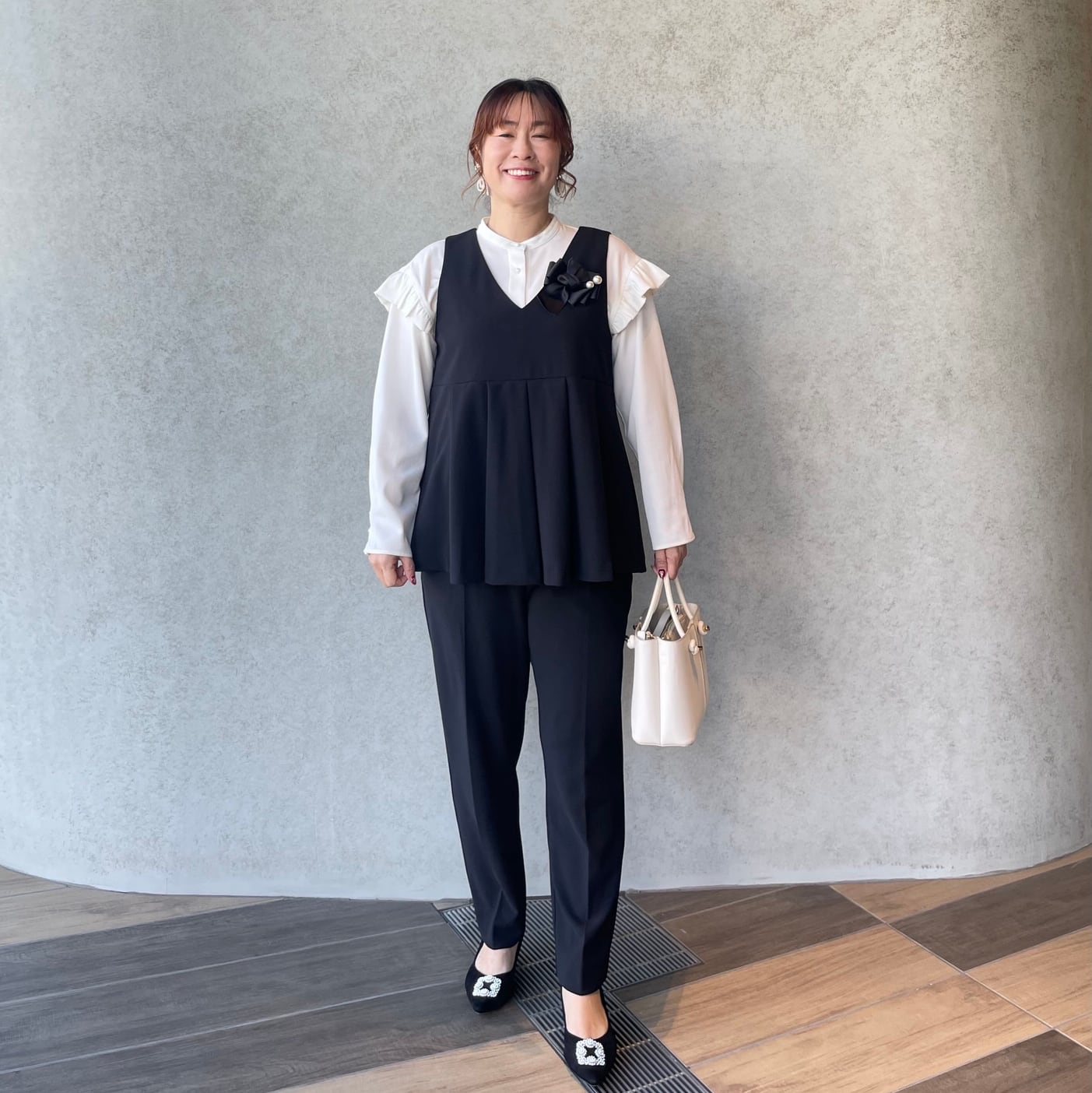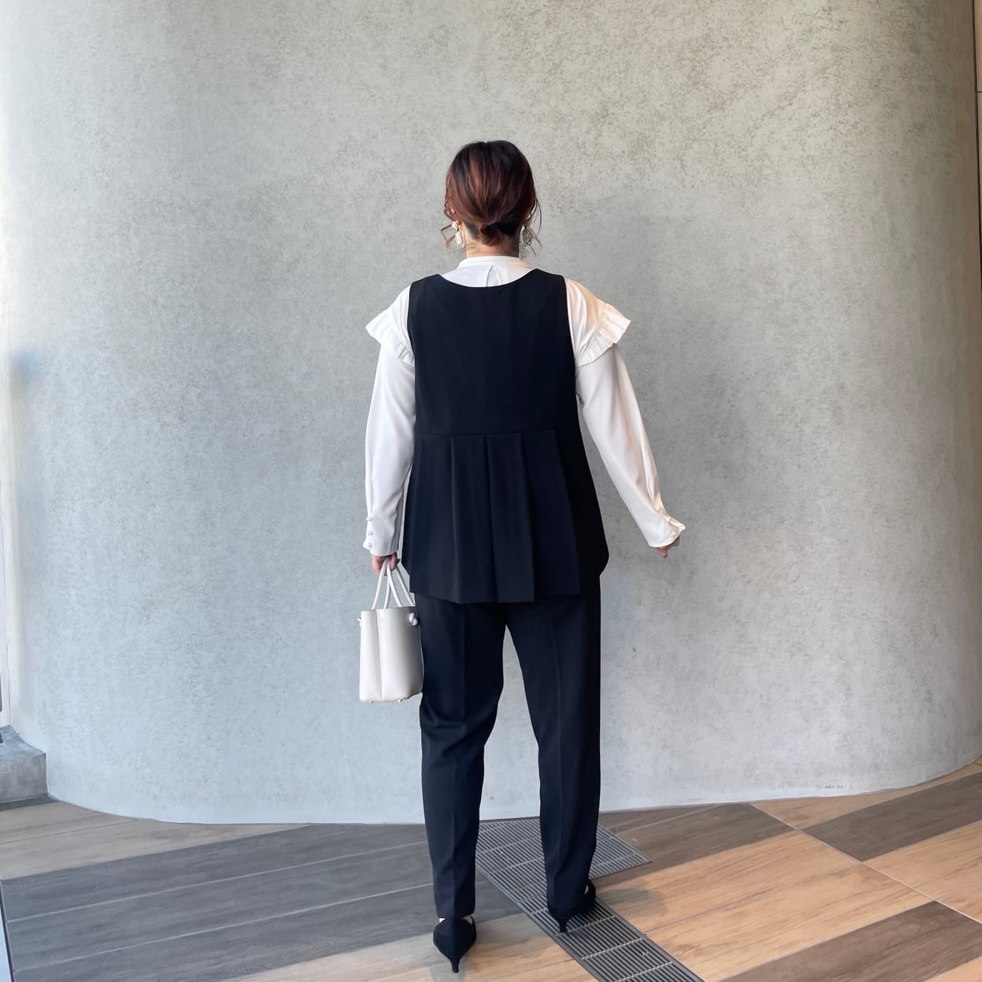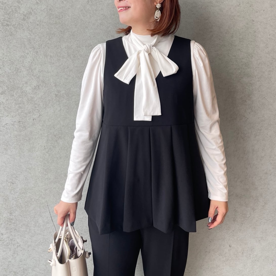 前後タックプリーツで程よくお洒落感あるVネックジレと、美脚ですっきり見えストレッチパンツの組み合わせ。