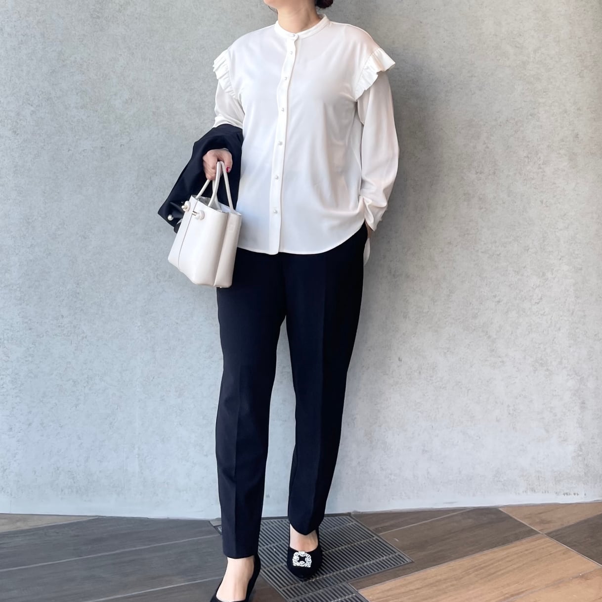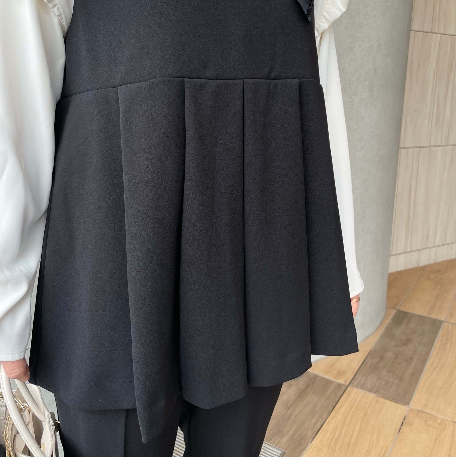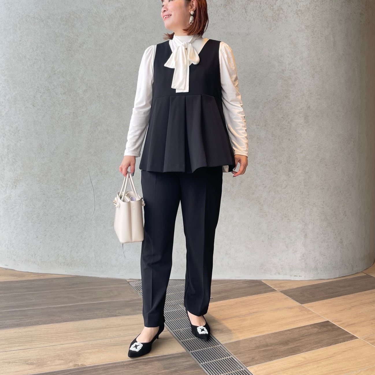前後タックプリーツで程よくお洒落感あるVネックジレと、美脚ですっきり見えストレッチパンツの組み合わせ。