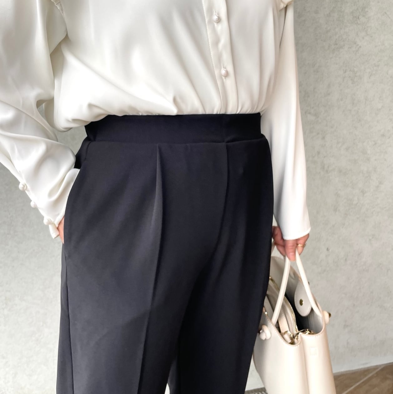 伸びの良いきれいめ素材を使用しているため、動きやすく、長時間の着用でもストレスフリー♪