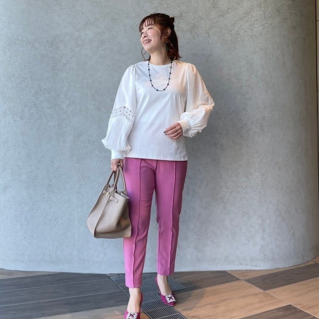 肩先のギャザーからふんわり広がる立体的なシルエットが、甘さを出しすぎず“程よい大人可愛さ”を演出してくれます。
