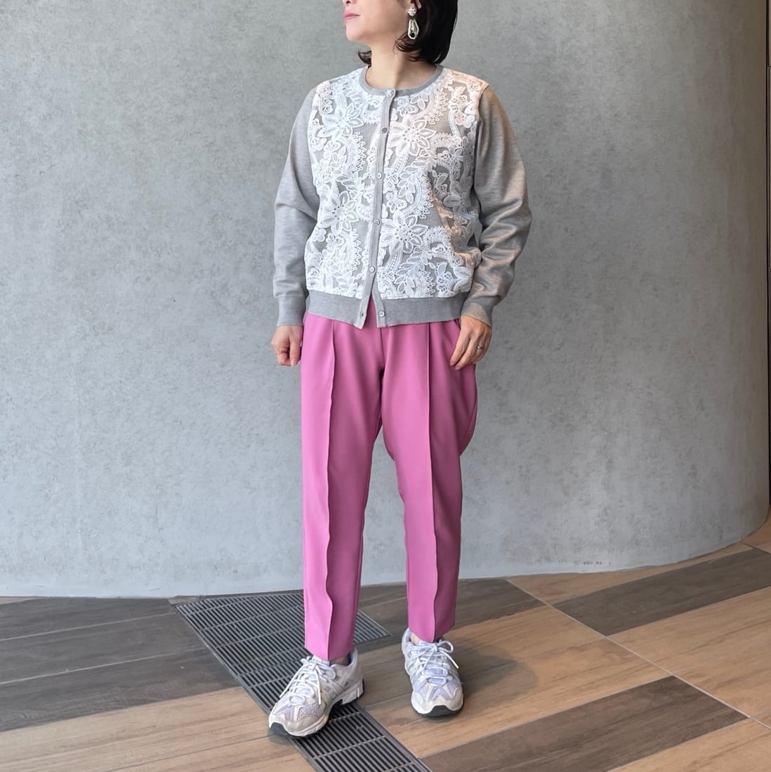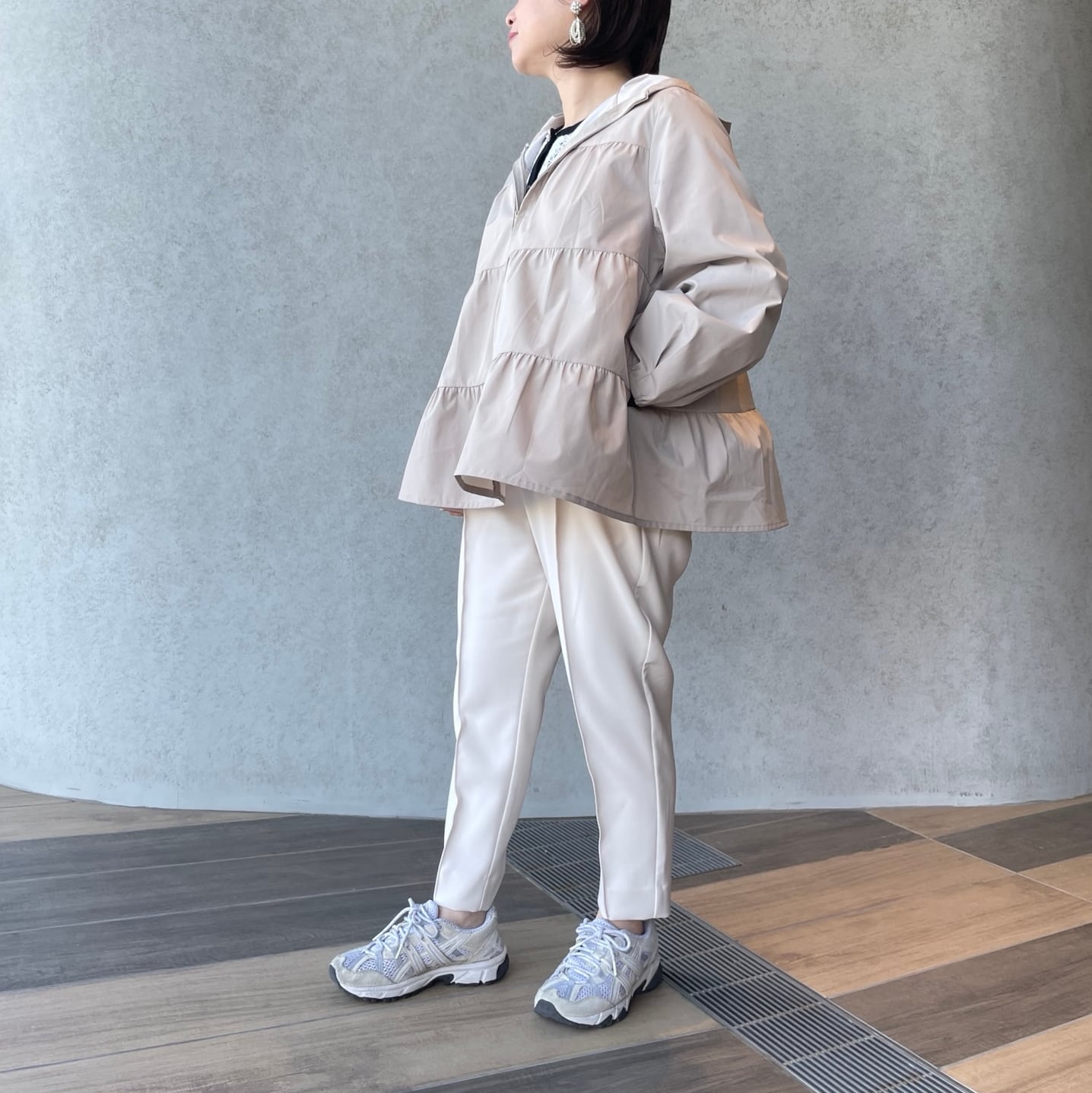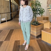 パンツのウエストは後ろゴムで前から見るとすっきり着やせ。