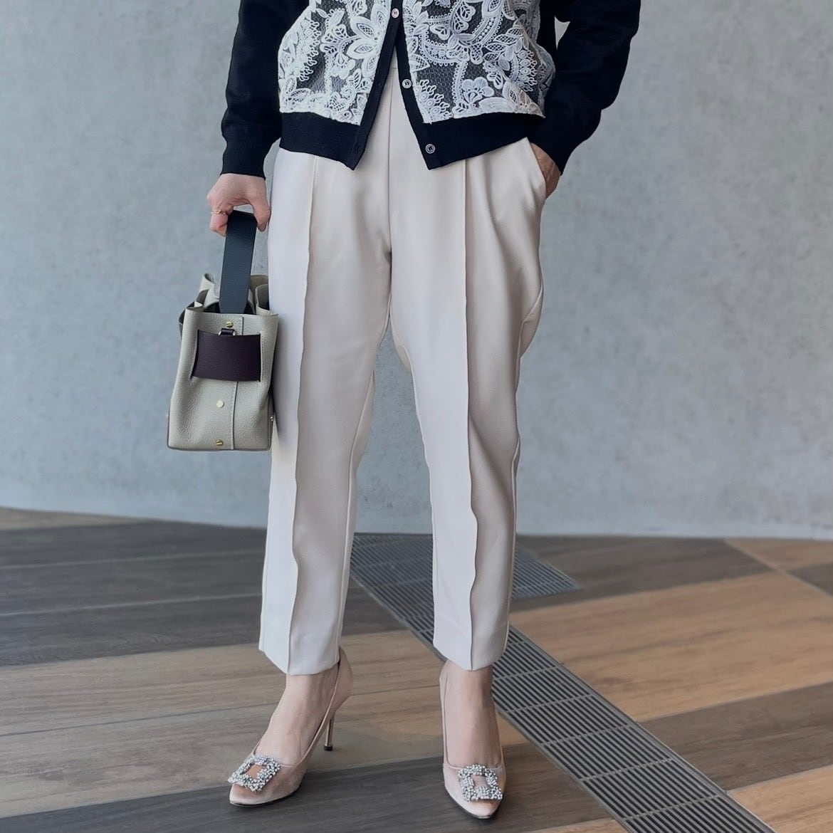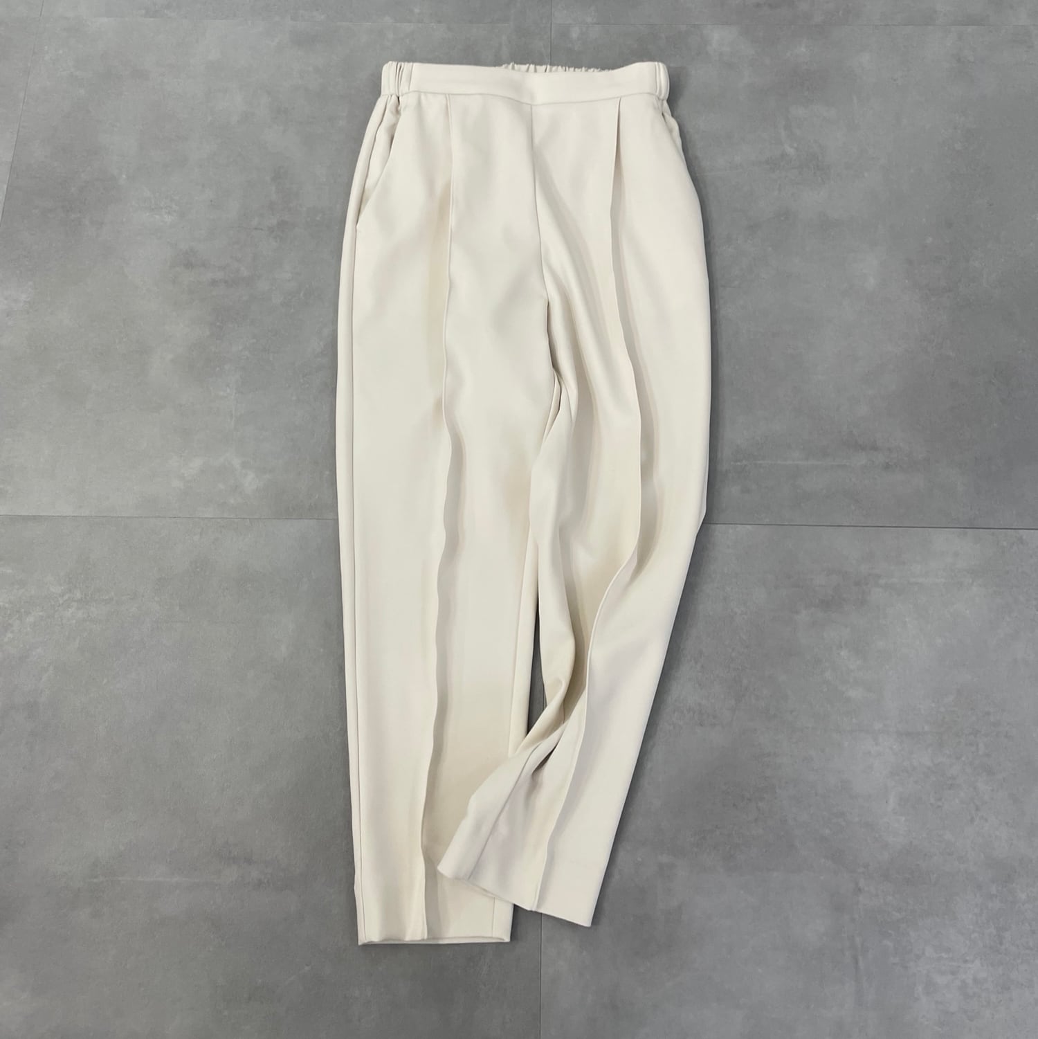 お腹周りがすっきり見えるタックテーパードシルエット、中央にはピンタックを入れ美脚効果も抜群!