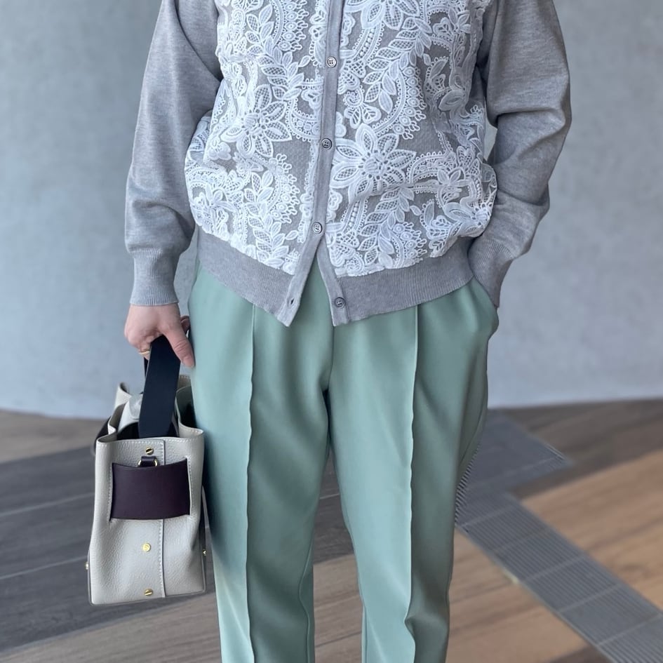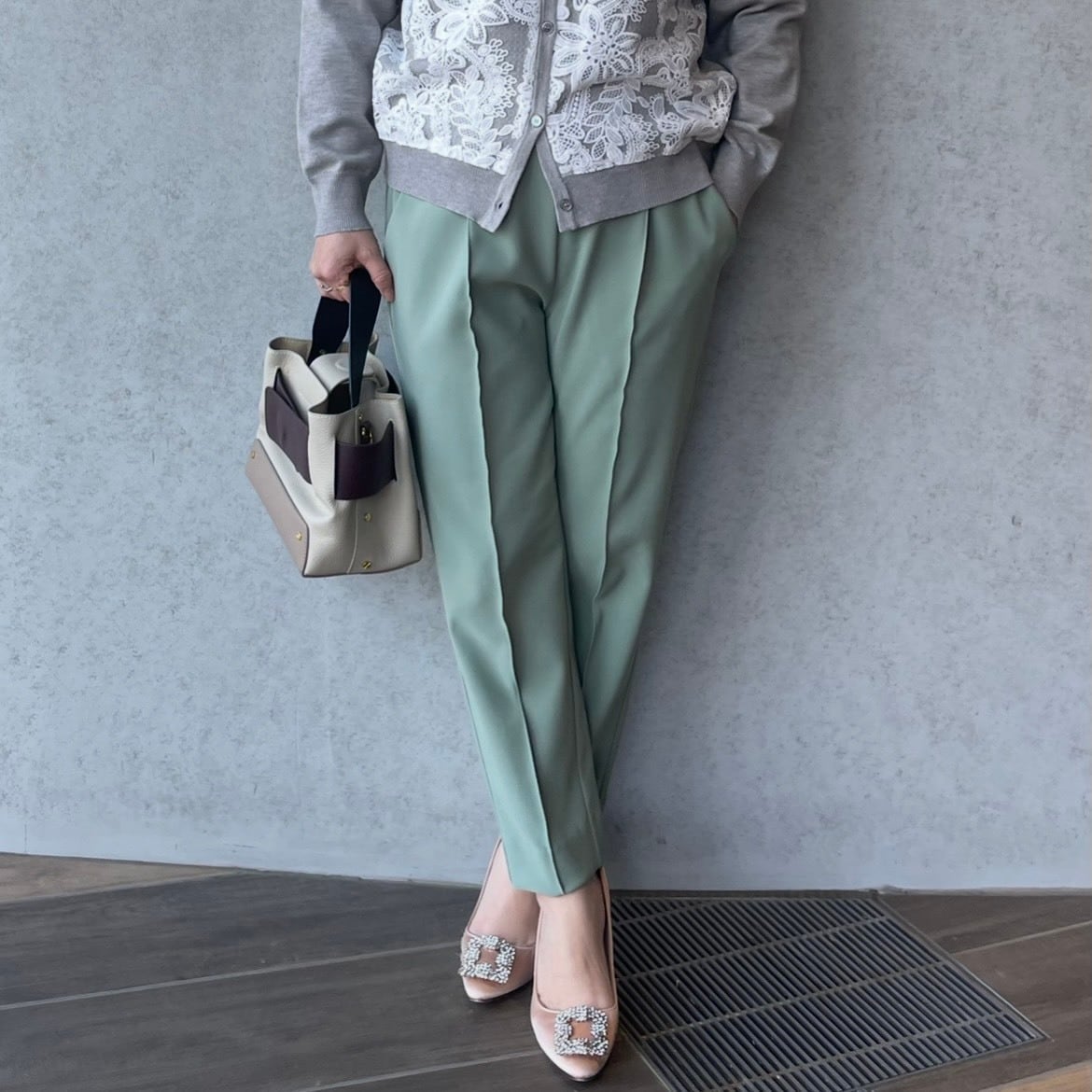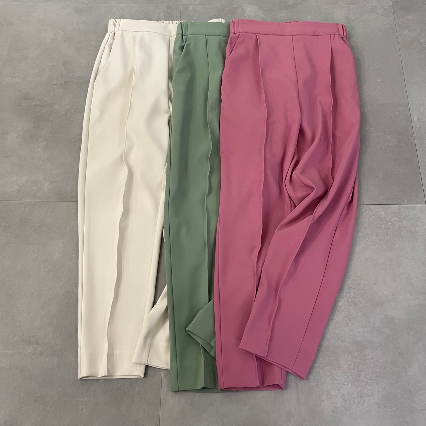 お腹周りがすっきり見えるタックテーパードシルエット、中央にはピンタックを入れ美脚効果も抜群!