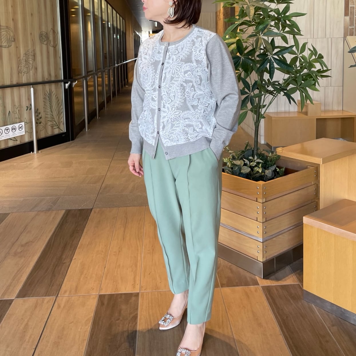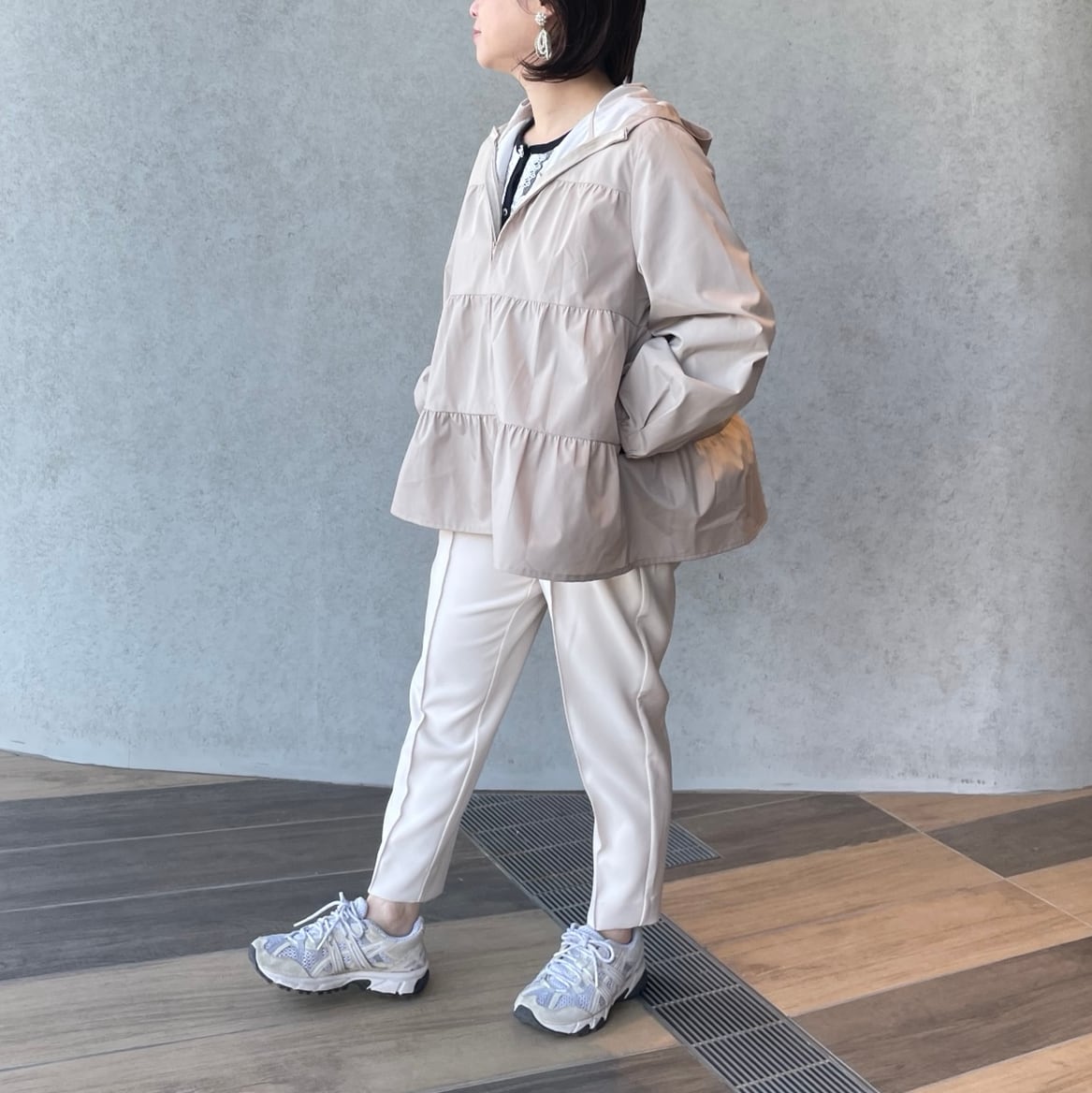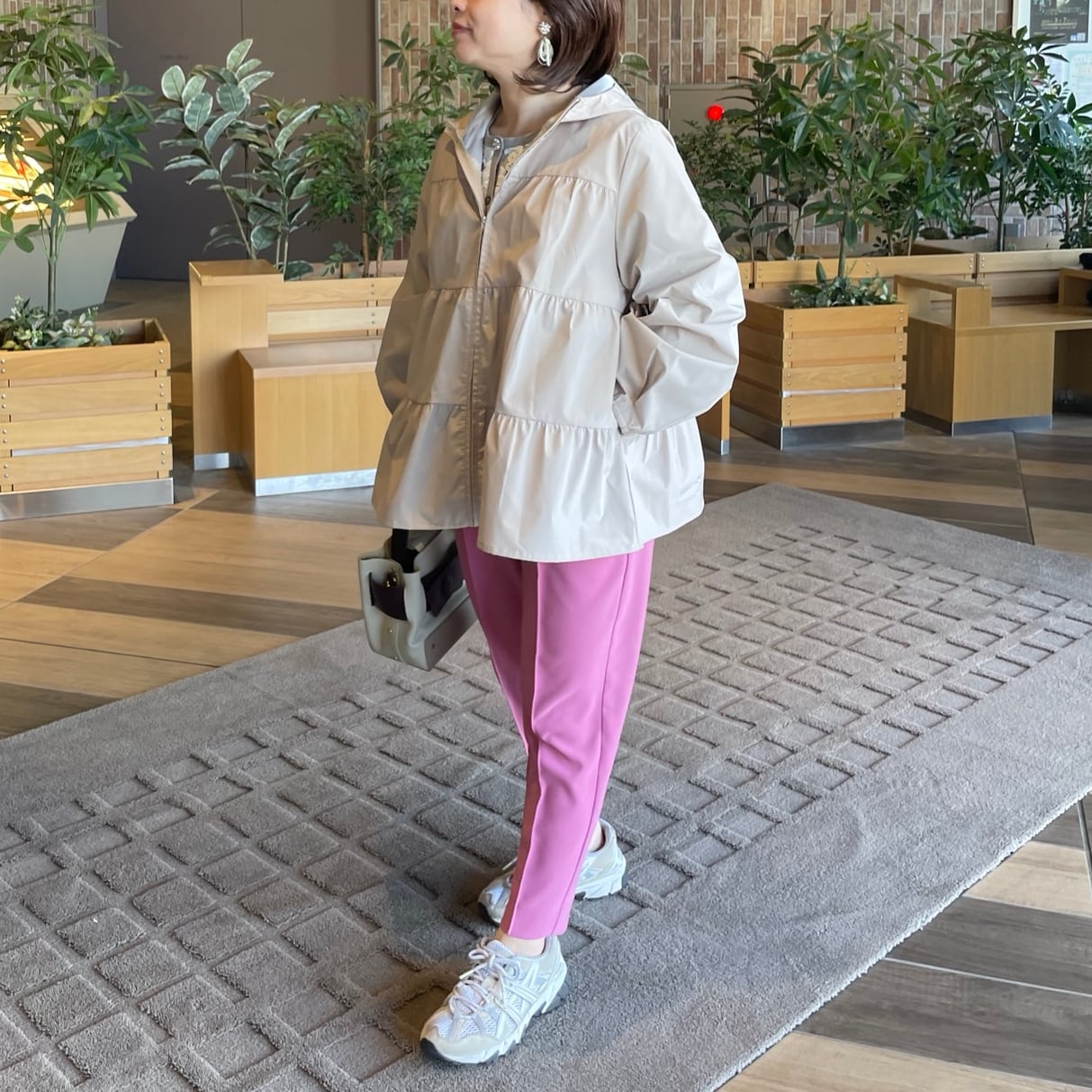 パンツのウエストは後ろゴムで前から見るとすっきり着やせ。