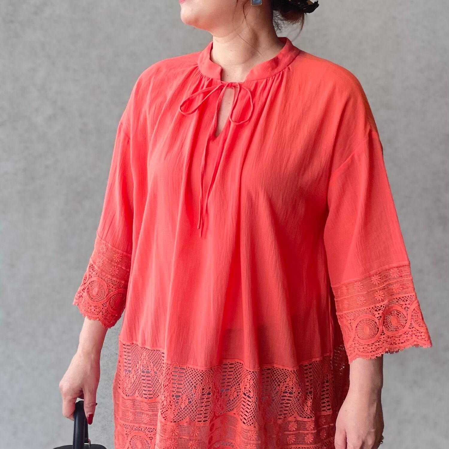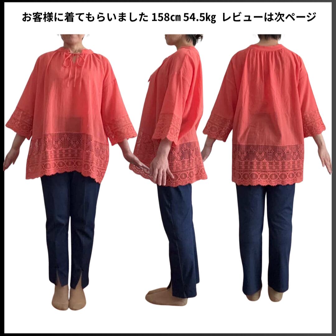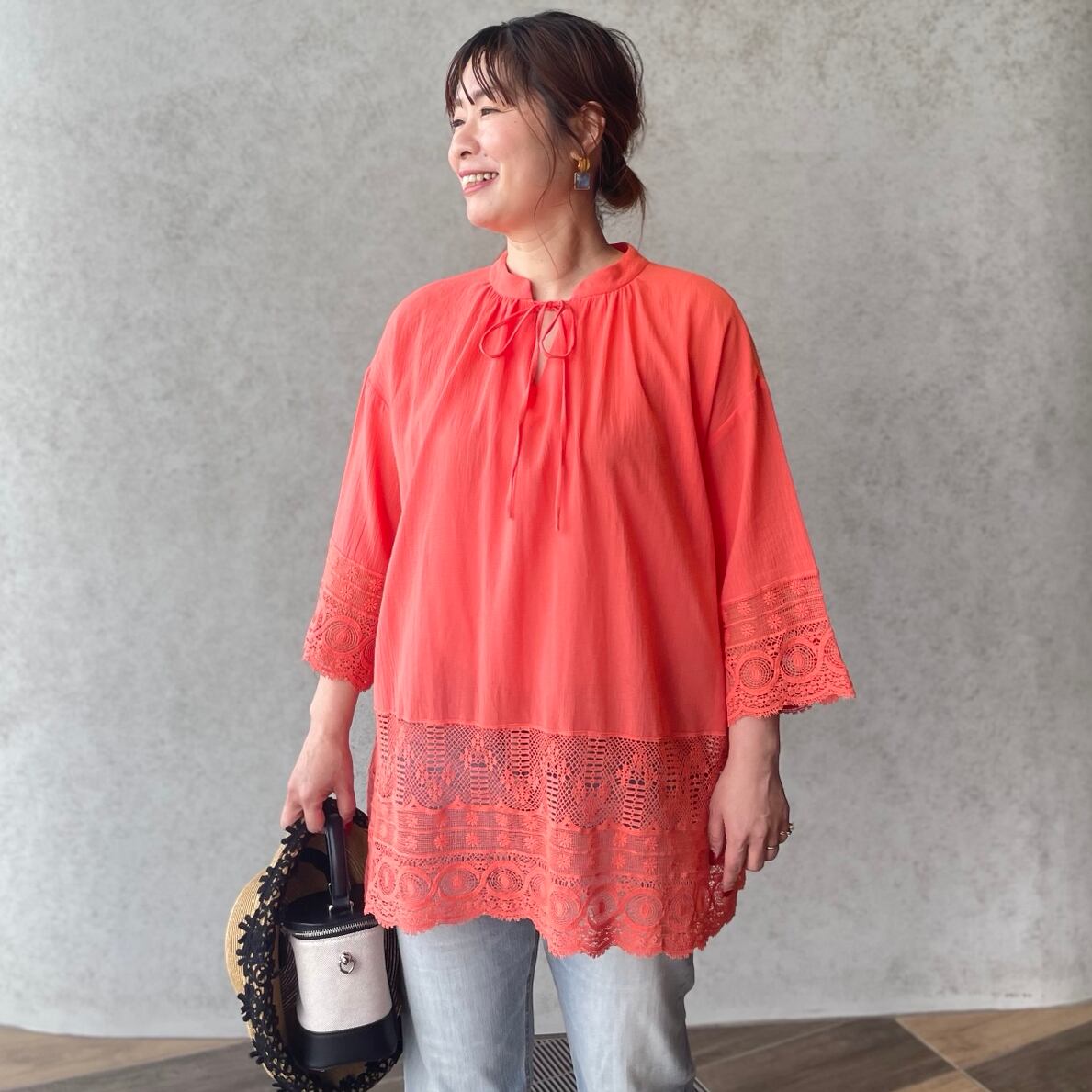 M~XXL◆超ゆったりで快適 レースが素敵なコットン100%チュニック オレンジ【FREE】KMC-794 106134