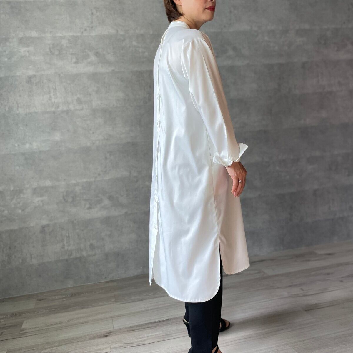後ろのボタンとサイドスリットで長めのゆったりシルエットでも動きや抜け感のあるデザイン。