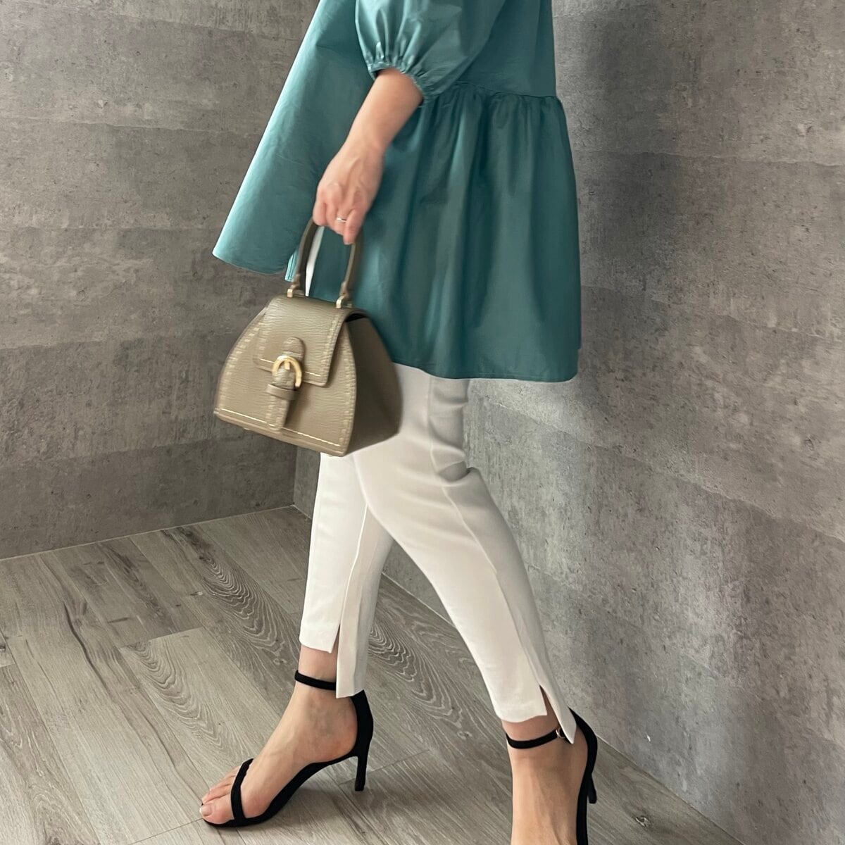 前後差をつけた裾デザインは、足首が見えることで細くすっきりとした印象に。