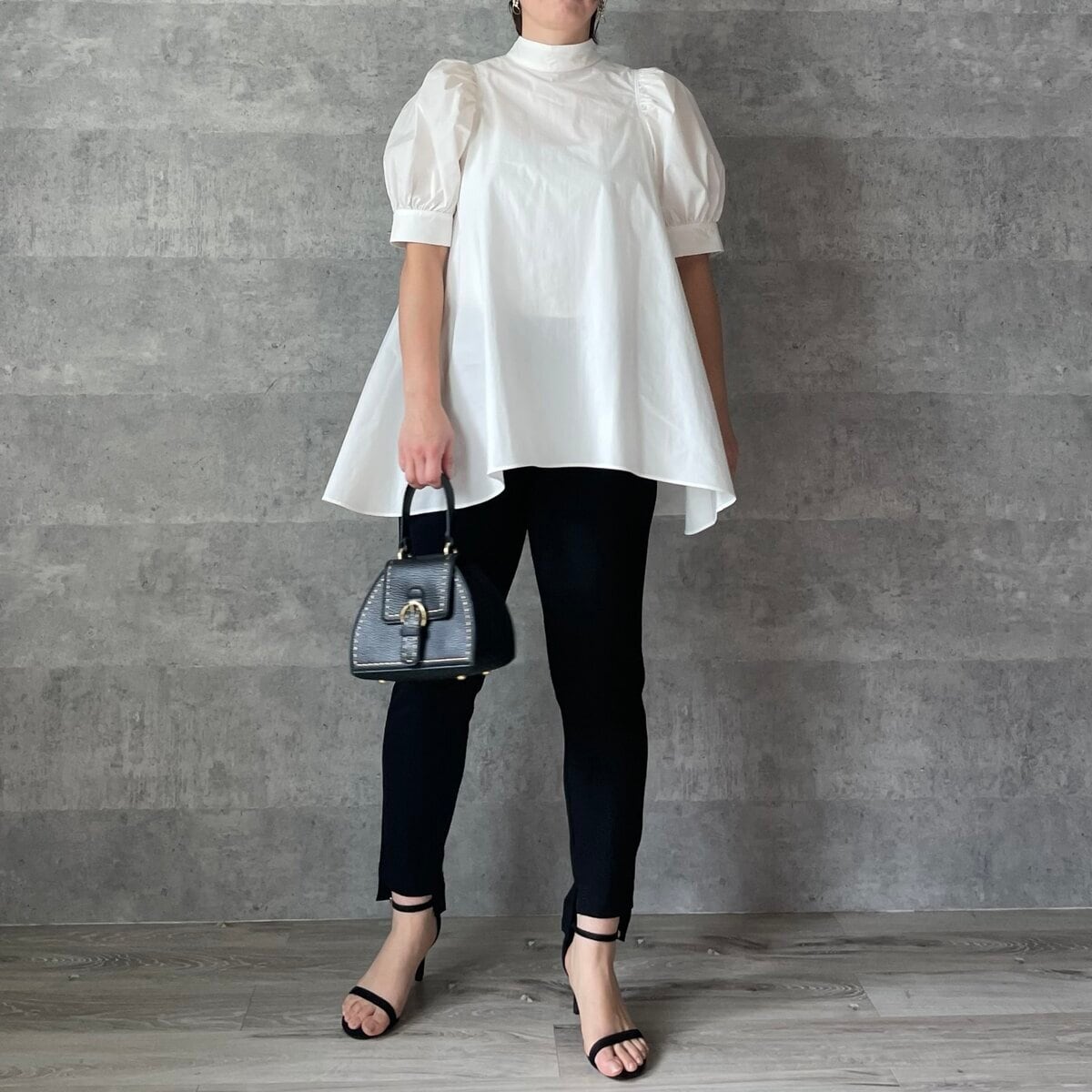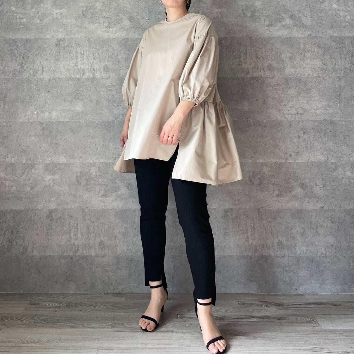 前後差をつけた裾デザインは、足首が見えることで細くすっきりとした印象に。