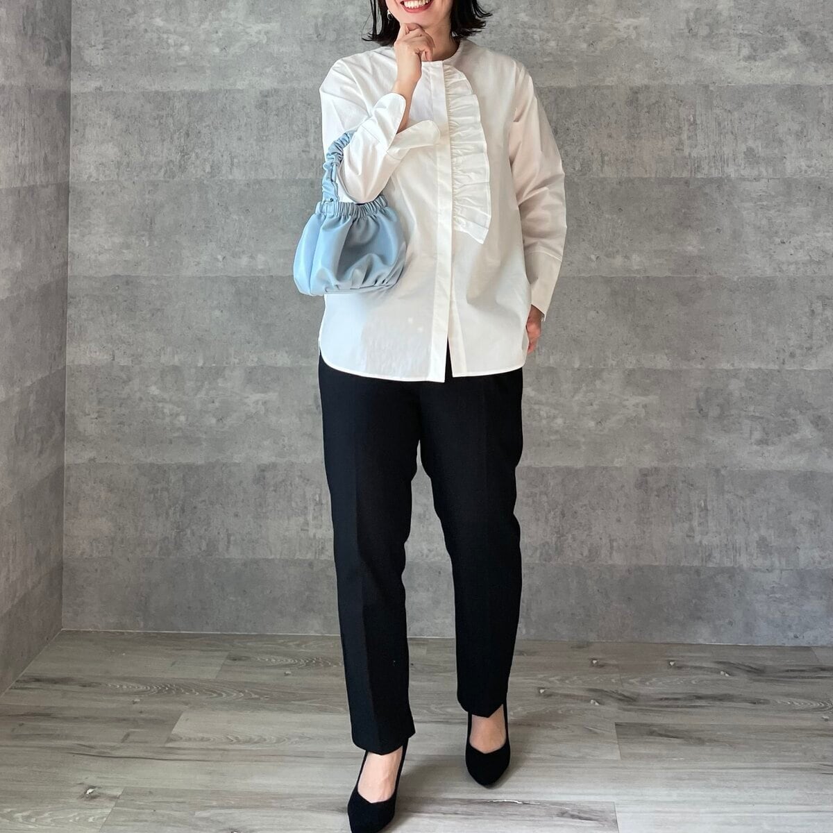 同素材のフラノトップスと合わせると、フォーマルシーンにも使えるセットアップに。