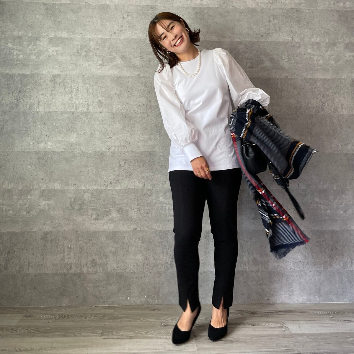 裾に入れたスリットやフロントのピンタックがシャープな印象で足長効果も抜群です。