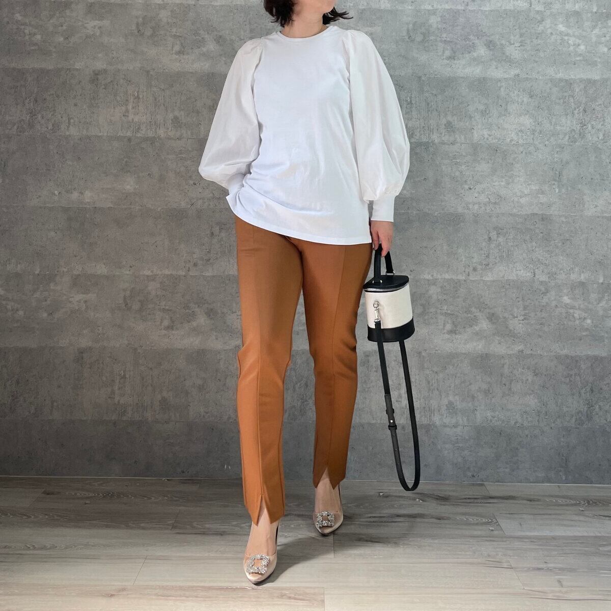 裾に入れたスリットやフロントのピンタックがシャープな印象で足長効果も抜群です。