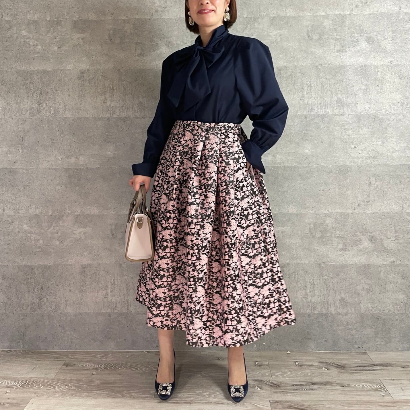 リボンブラウスやジャケット合わせでハレの日に、ニットやカットソー合わせでオフィスカジュアルにも着回しできます。