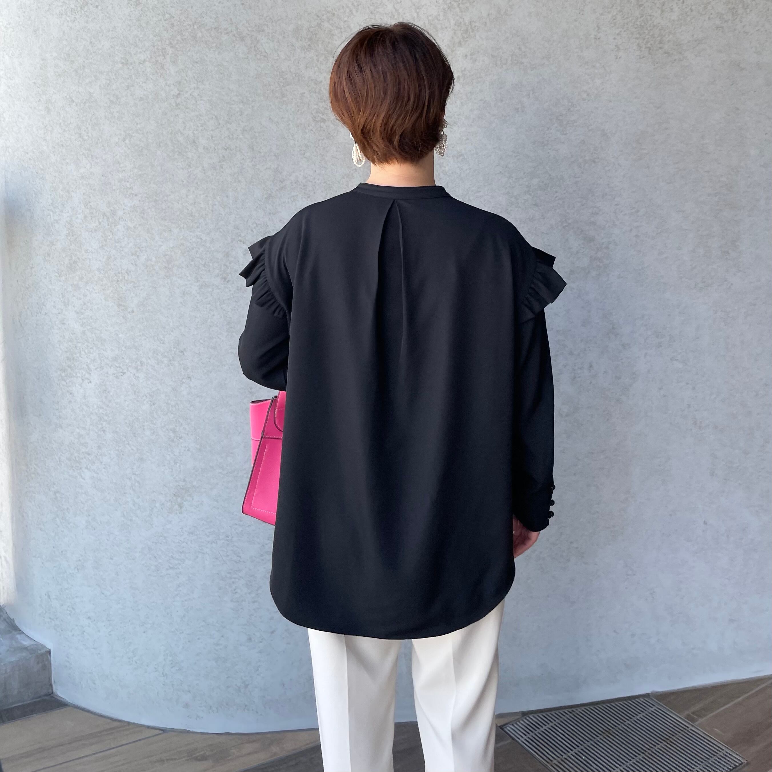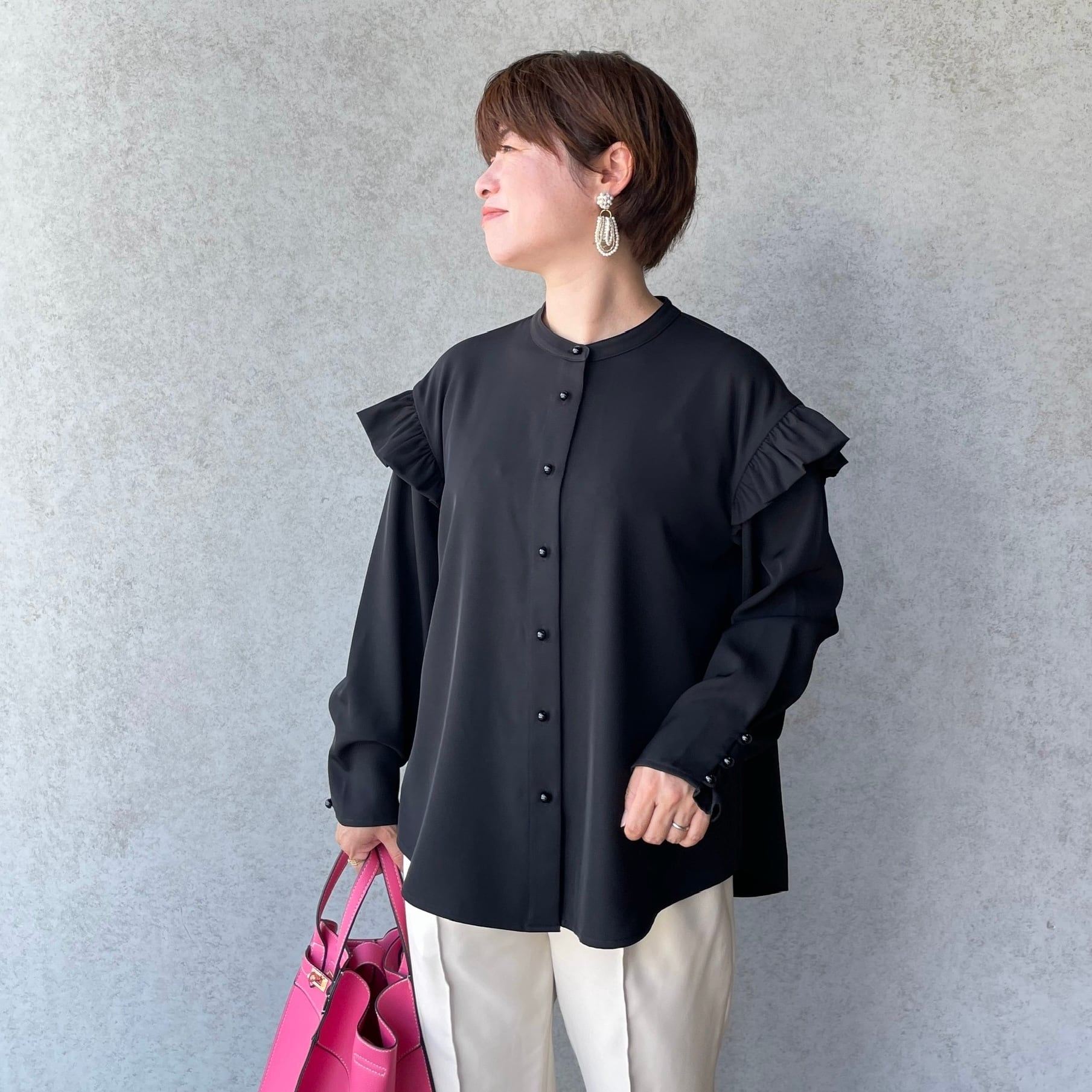 カジュアルはもちろん、フォーマルなアイテムやきちんと感のある通勤着としても使える着映え抜群のフリルブラウス。