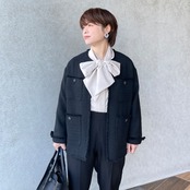 襟部分はノーカラー、縁のフリンジデザインにすることで、幅広いインナーアイテムと好相性。